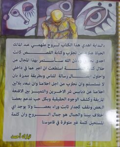 إهداء شخصي: ( اهداء لروح عبد المالك وهو شخص فاقد للبصر كان حلمه يقرأ القصص ويطلع عليها كما يطلع عليها المبصرين )